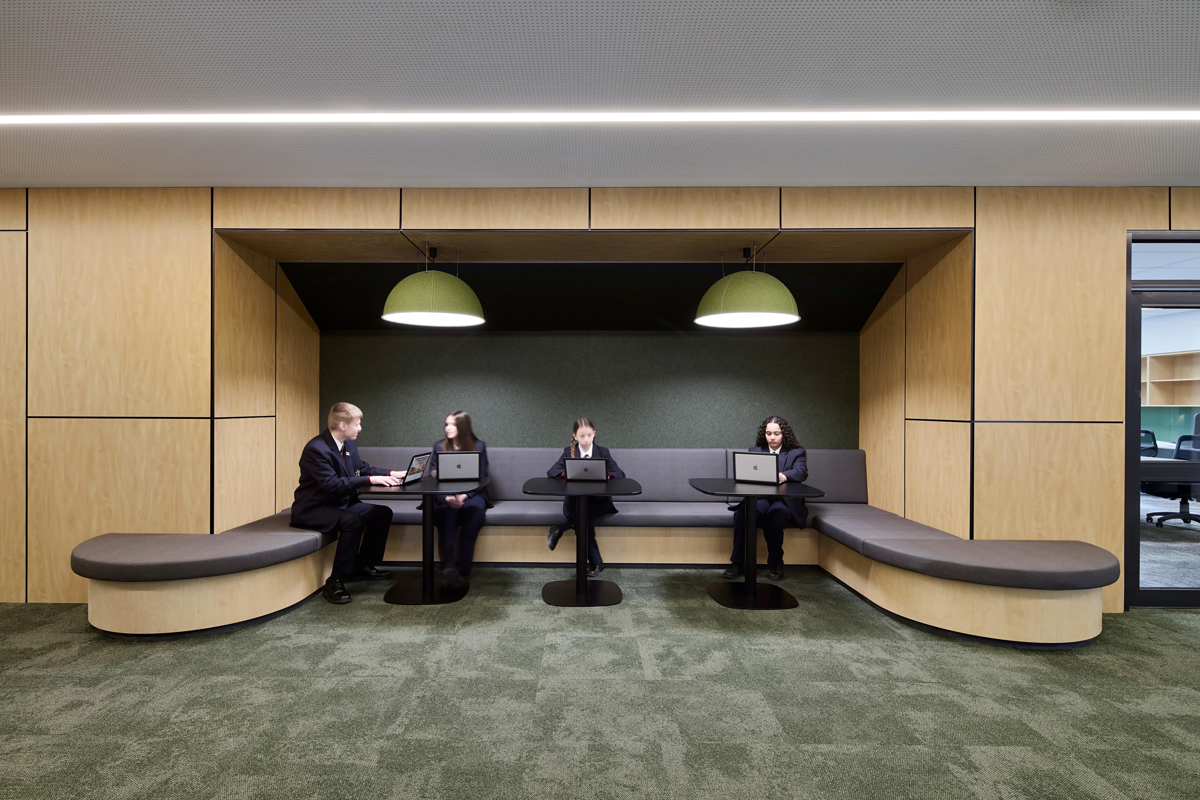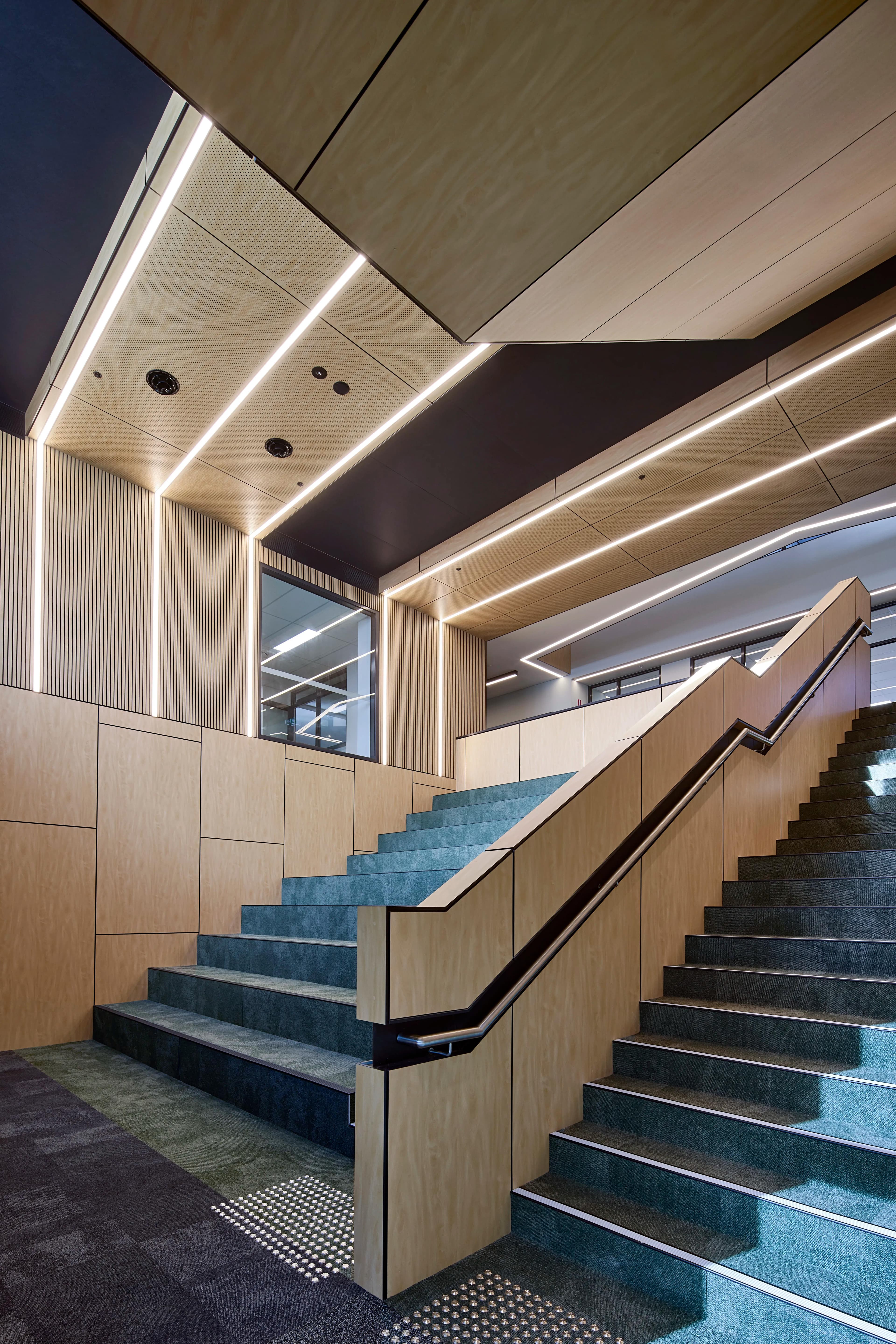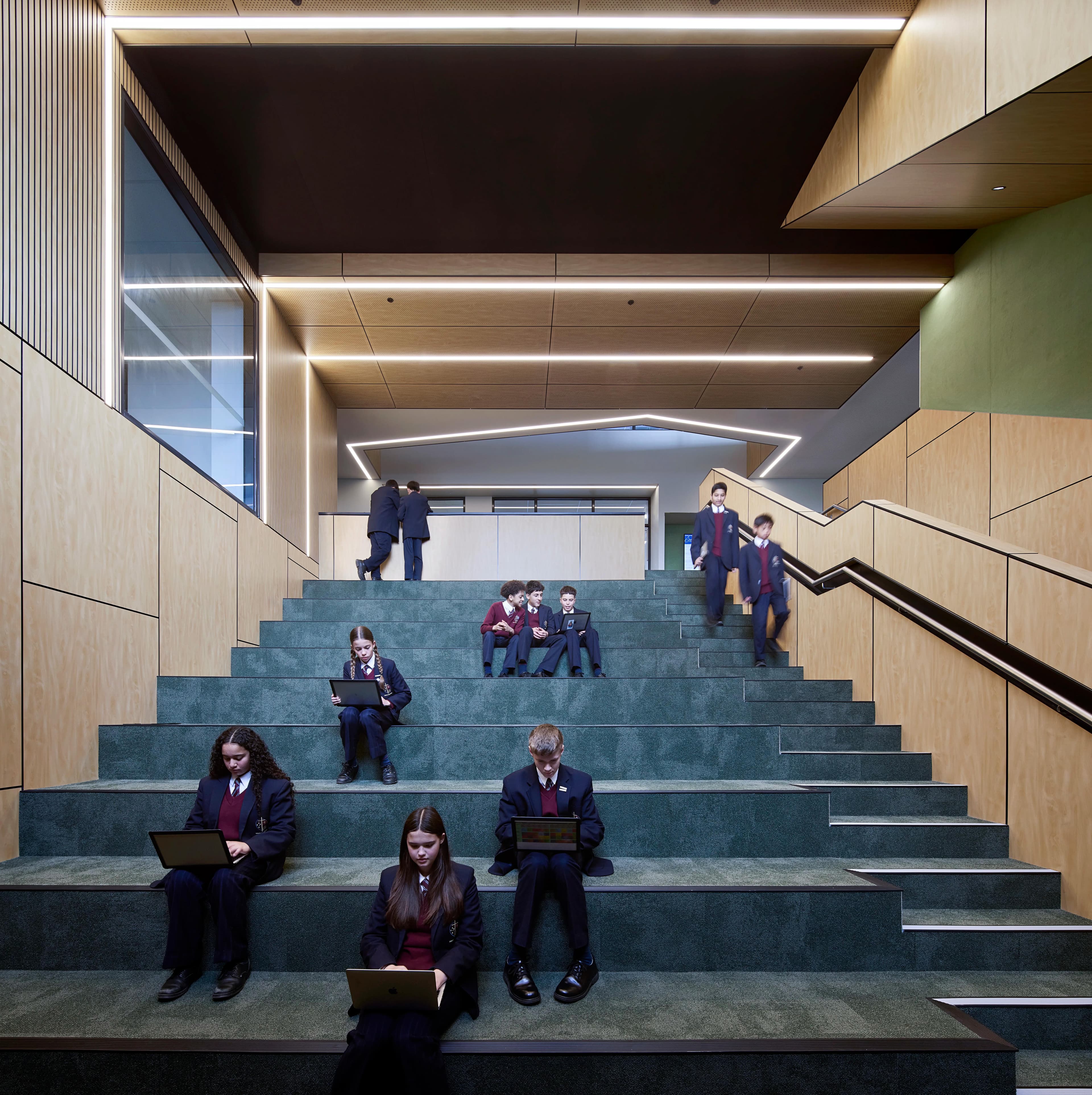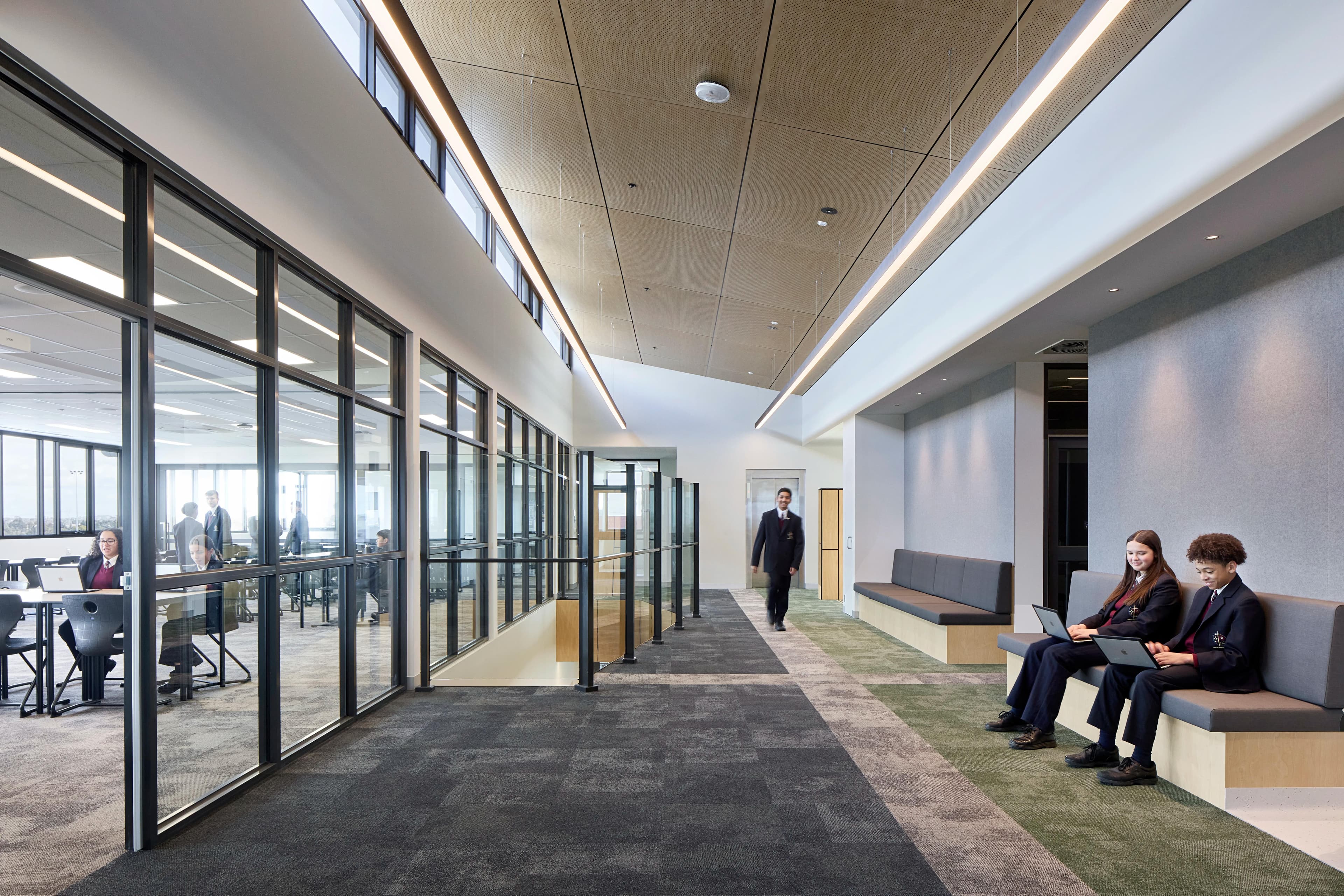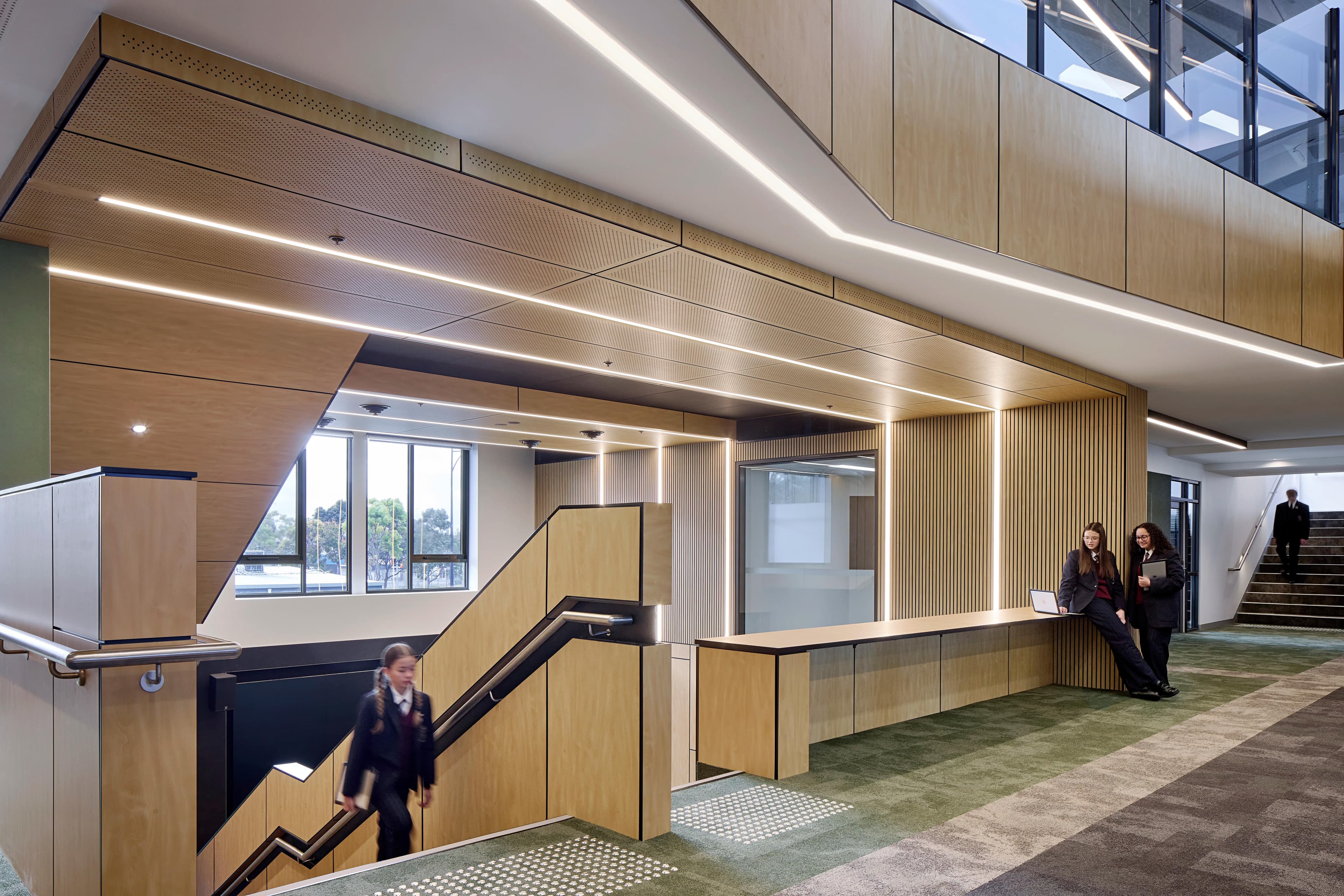 Student-centred breakout zones are distributed through the facility, offering alternative spaces for collaborative and innovative learning. Additionally, students' artwork can be showcased in the centralised multi-purpose gallery and collaboration space, which extends beyond the art studios on the first floor. Voids have been integrated throughout the design, creating a seamless connection between the levels as users ascend the building. Notably, the project also features a two-storey amphitheatre with tiered seating.