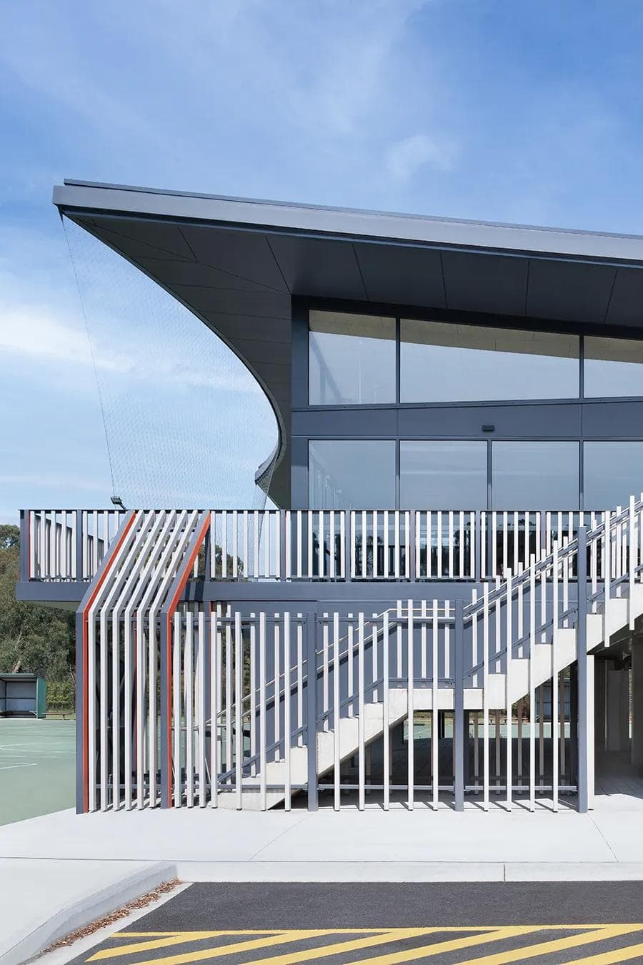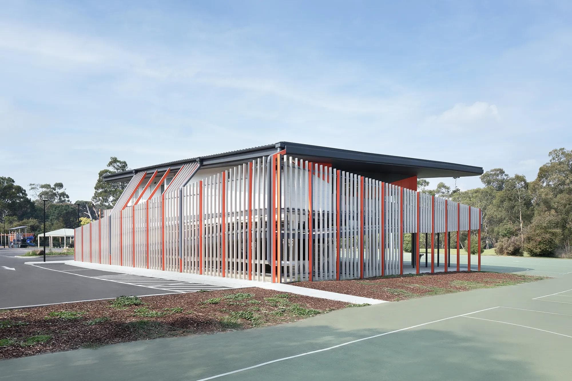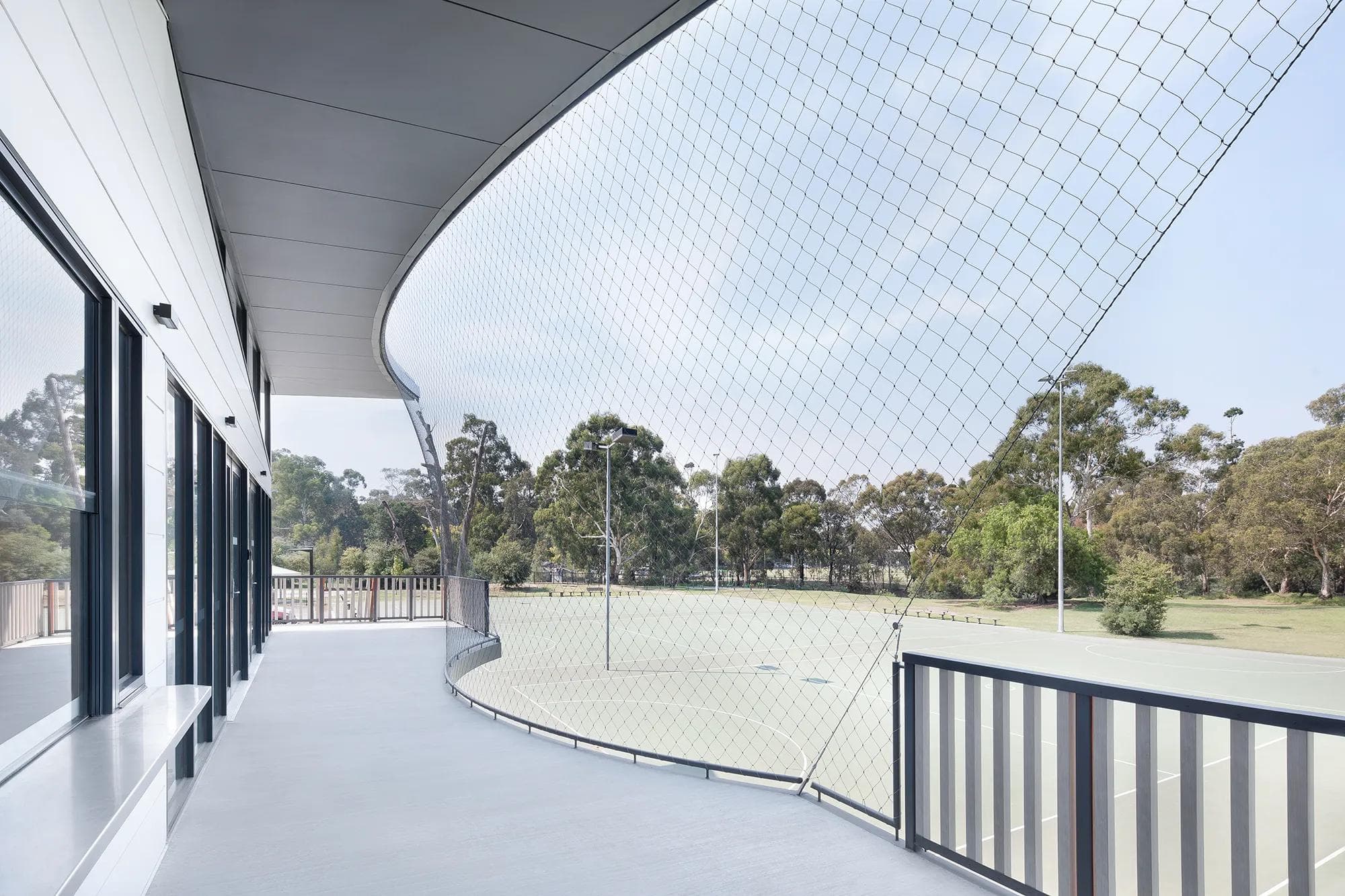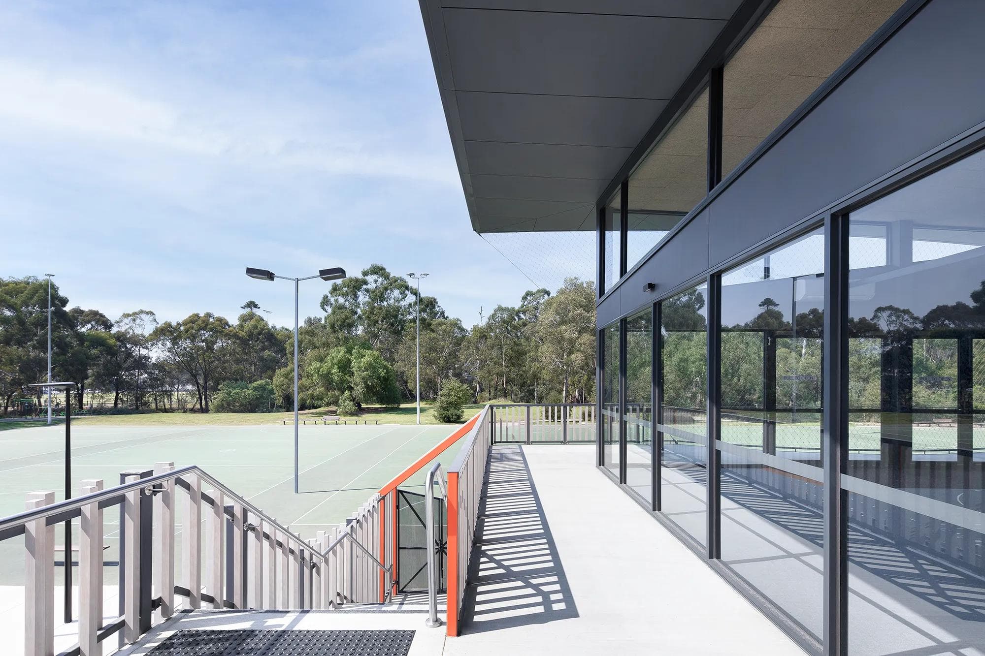 A two-storey, 600m2 netball pavilion was constructed, along with associated works to extend the existing car park, in addition laying another car parking space to accommodate the new facility. An open undercroft occupies the ground level, to prevent potential flood damage from the nearby creek. The first floor features a commercial kitchen and cafeteria, change rooms, first aid amenities and a large multi-purpose room; which extends out to an undercover spectators area. This space features a curved structure and wire mesh, designed to portray the netball ring and net. This facility is wheelchair accessible, with a ramp wrapping around either side of the facility’s exterior.