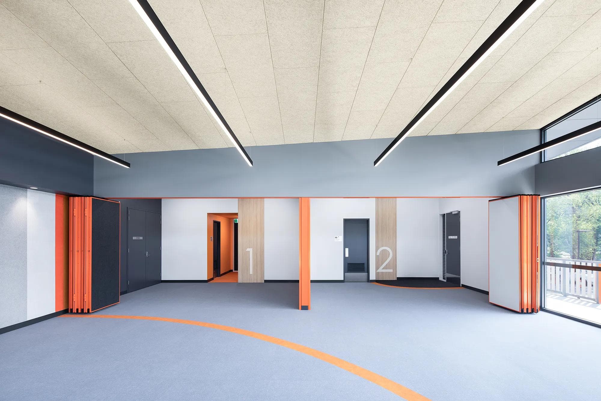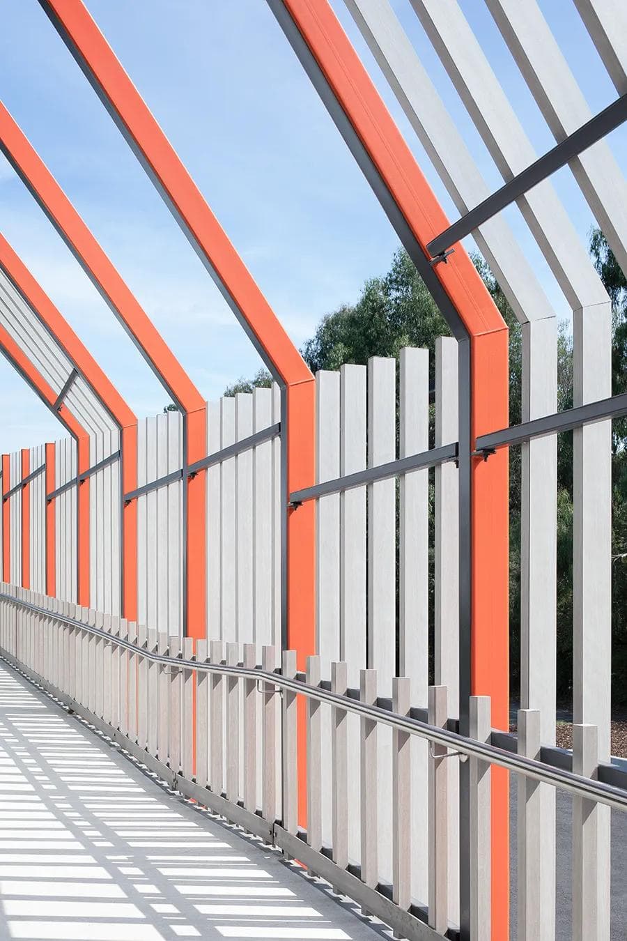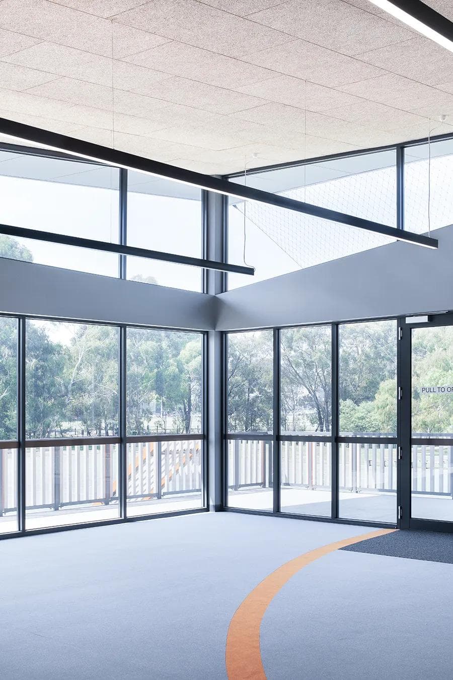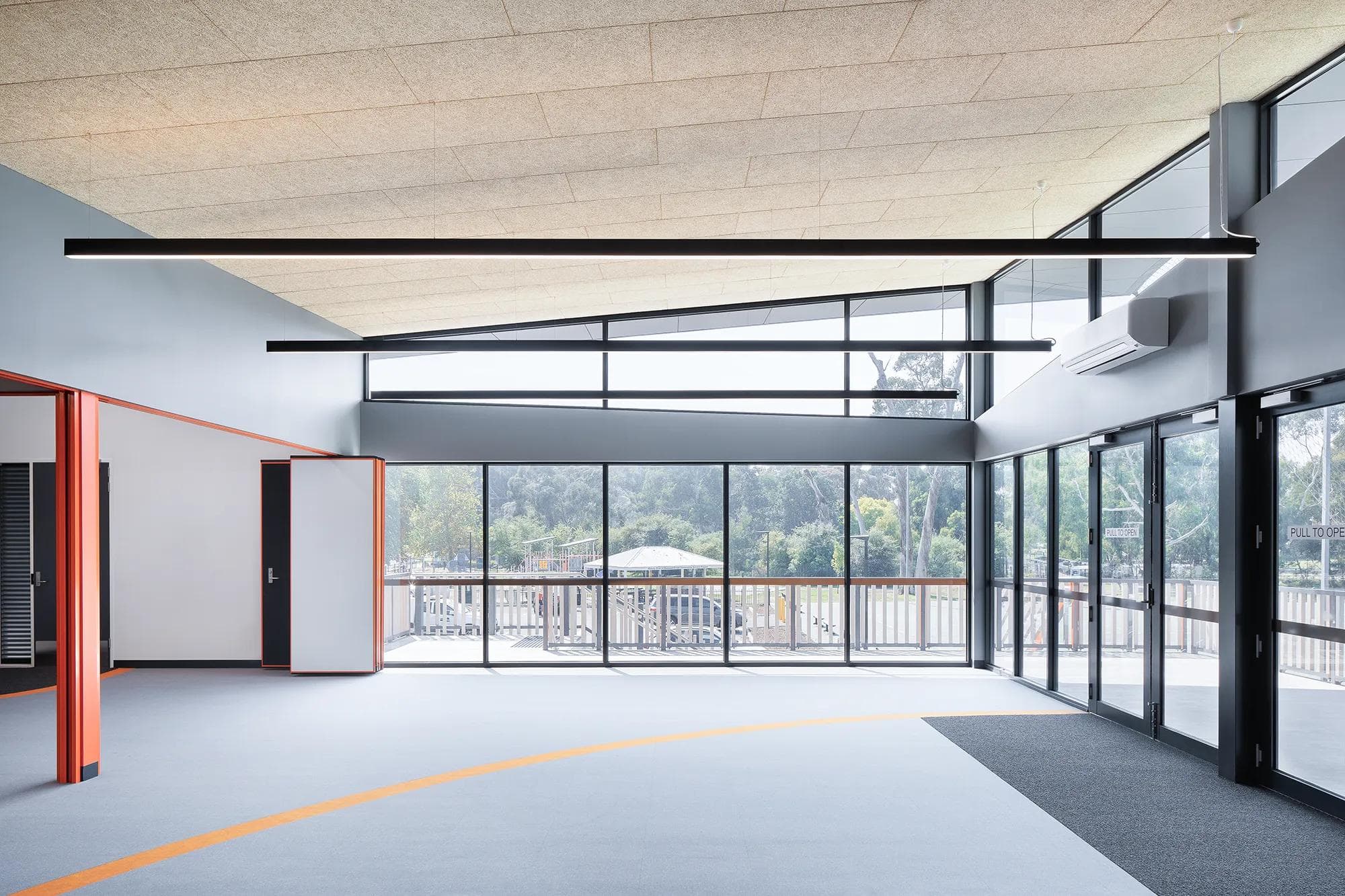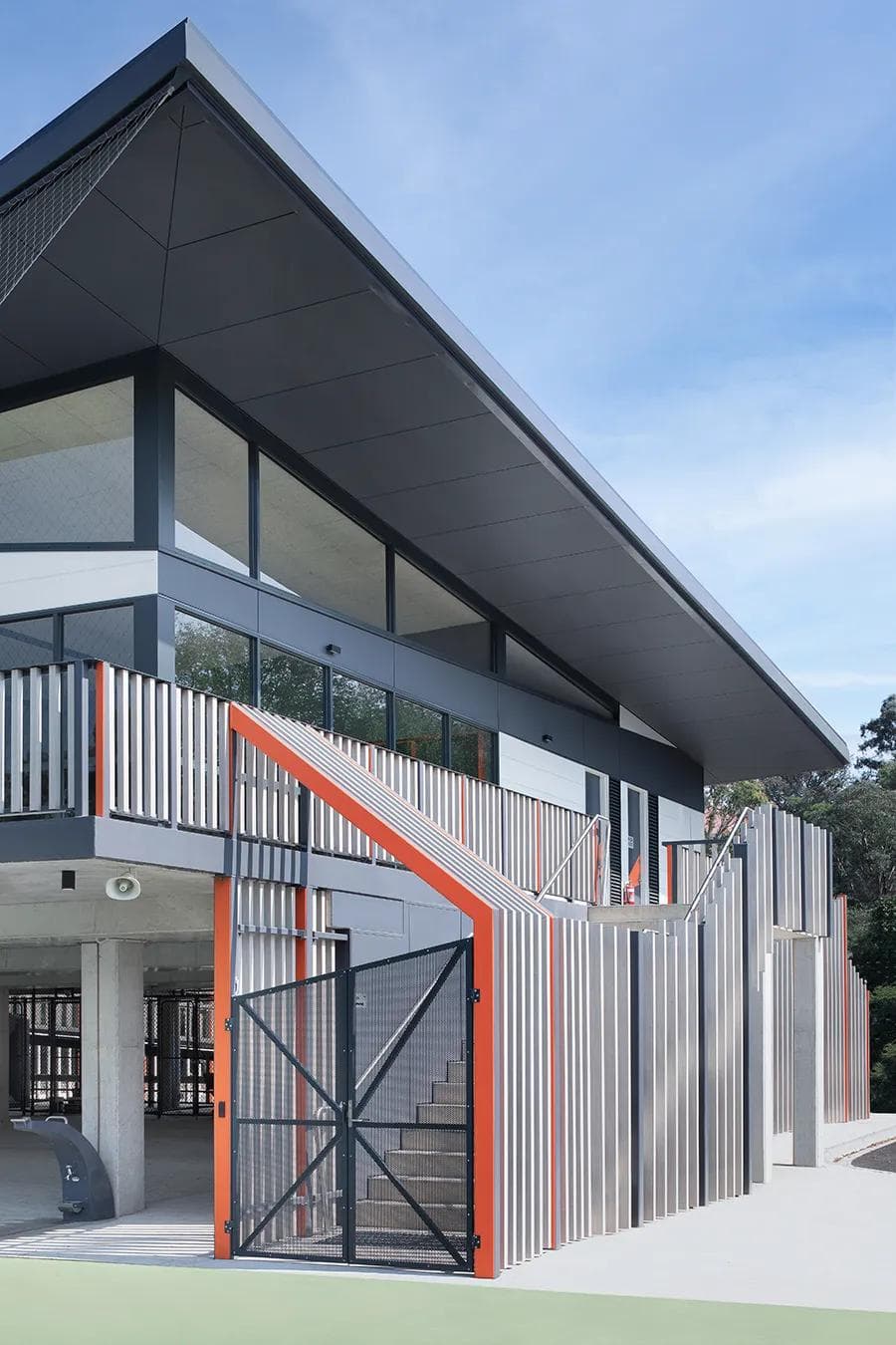 A two-storey, 600m2 netball pavilion was constructed, along with associated works to extend the existing car park, in addition laying another car parking space to accommodate the new facility. An open undercroft occupies the ground level, to prevent potential flood damage from the nearby creek. The first floor features a commercial kitchen and cafeteria, change rooms, first aid amenities and a large multi-purpose room; which extends out to an undercover spectators area. This space features a curved structure and wire mesh, designed to portray the netball ring and net. This facility is wheelchair accessible, with a ramp wrapping around either side of the facility’s exterior.