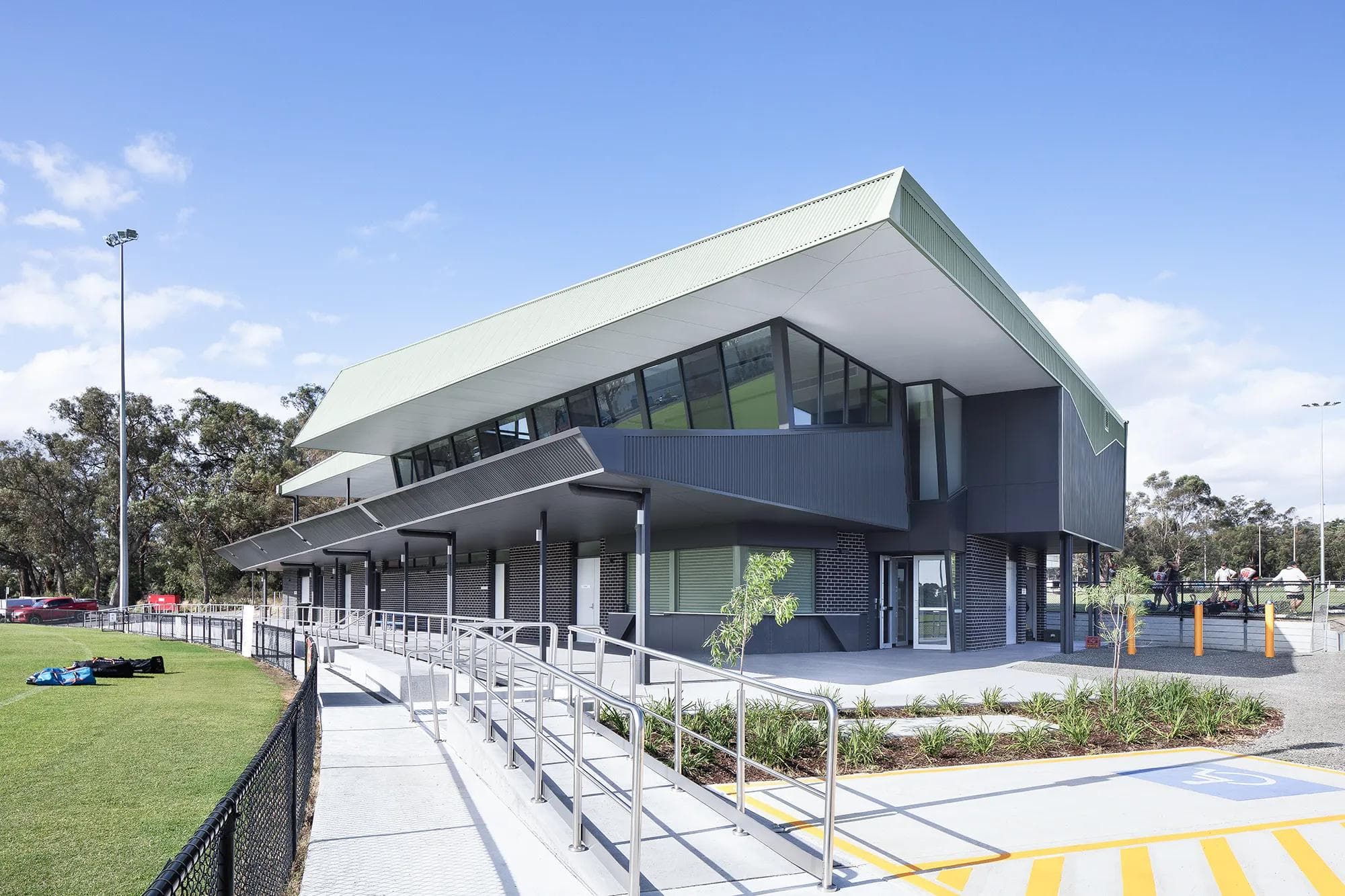 Newpol were engaged to deliver a two-storey sports pavilion in Kilsyth. This new facility comprises six change rooms and amenities, a kiosk, as well as first aid and gym facilities. The first floor, which is accessible by the lift located in the entry lobby, houses the community social room that showcases unobstructed views of Pinks Reserve. This level also features a large semi-commercial kitchen and servery, a terrace, and scorer rooms for each oval. Externally, undercover spectator viewing areas are provided, which was surrounded by a hard and soft landscaping package. This project marks the completion of the third precinct within the Yarra Ranges Council’s Pinks Reserve Masterplan.