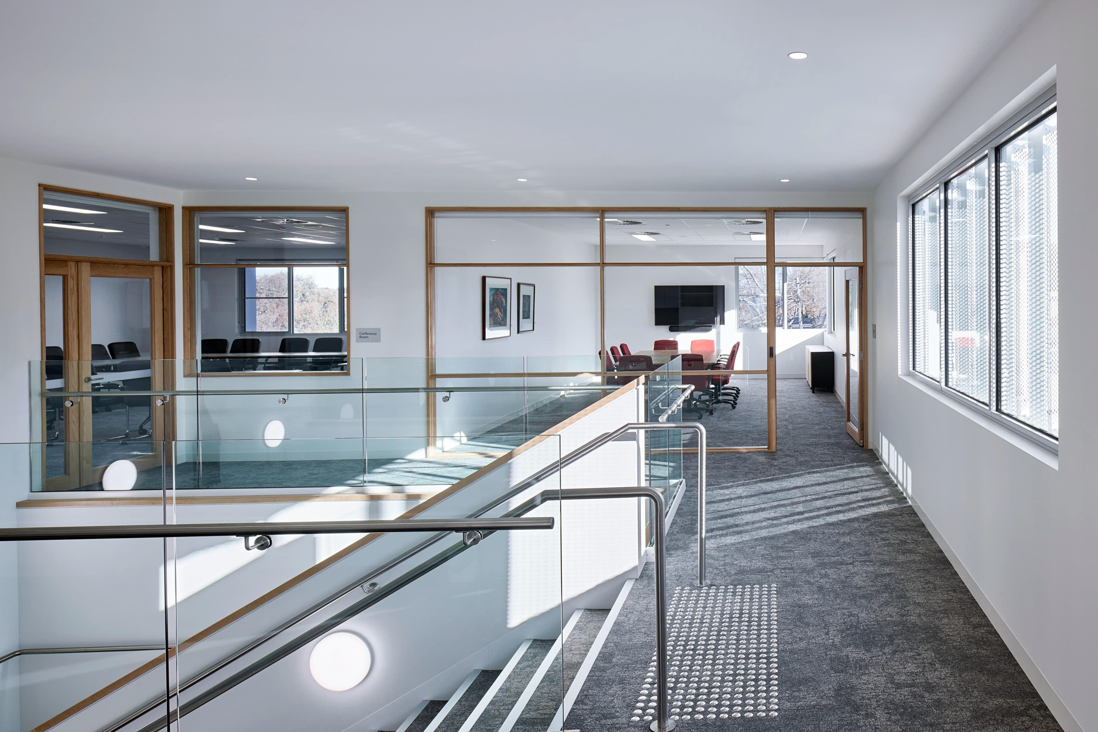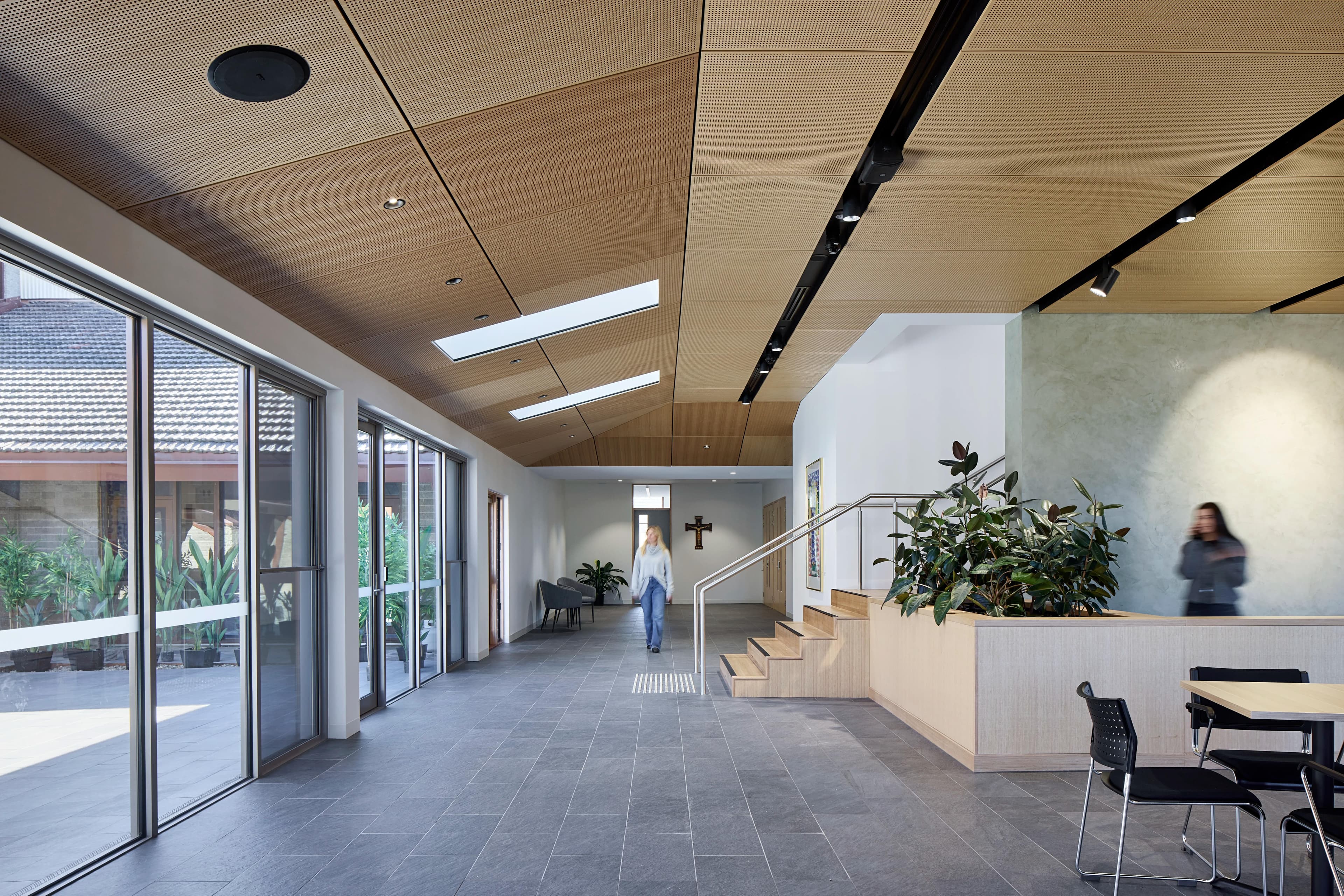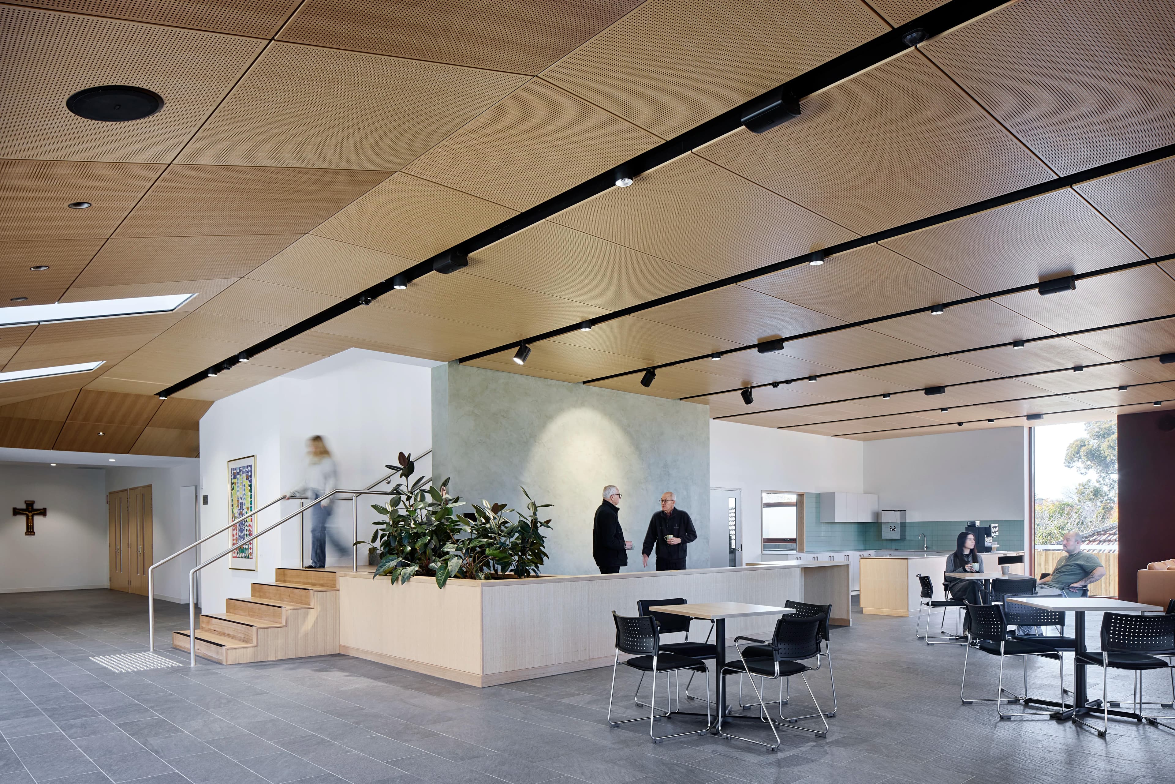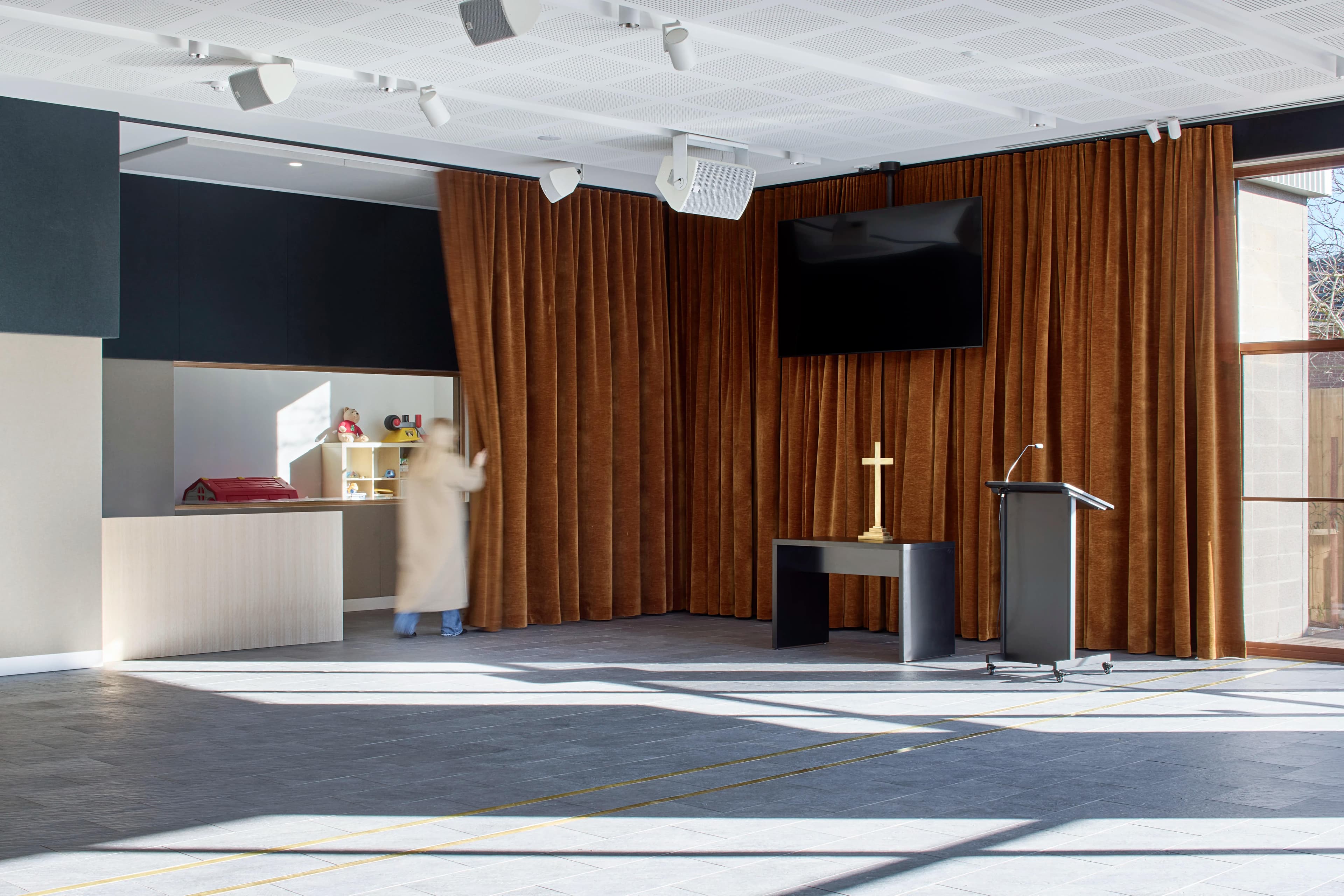 The ground floor incorporates large open halls, ministry offices, and vestries, as well as a courtyard, creche, and kitchen facilities. Whilst, level one houses various office spaces, meeting rooms, and breakout spaces. Newpol’s scope further involved the installation of a new enclosure and roof to the existing bell tower, which required the removal of the existing timber battens in order to grant access.